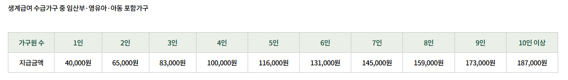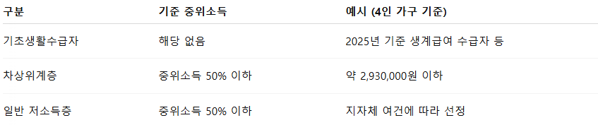 - 기초생활수급자 (생계·의료·주거·교육급여 수급자)