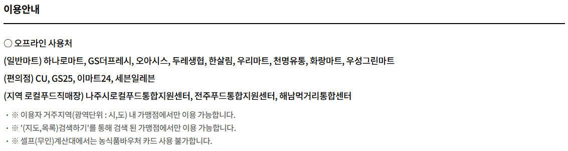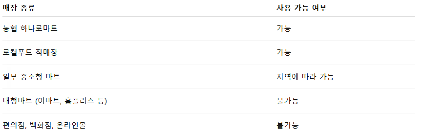 농식품바우처는 농림축산식품부와 제휴된 오프라인 매장 중심으로 운영되며, 일반 대형마트나 온라인쇼핑몰에서는 사용할 수 없습니다. ‘로컬푸드’ 또는 ‘농협 직영’ 마트 위주로 찾으시는 것이 좋습니다.